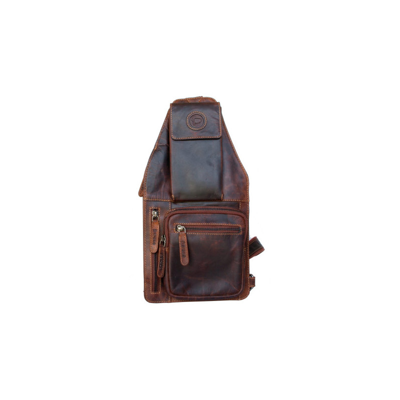 Netradiční kožený baťůžek Pedro na nošení přes rameno z pevné kůže s látkovou...