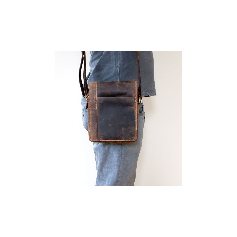 Střední pánská taška z pevné kůže s popruhem přes rameno bez značek a nápisů. Rozměr 20 x 24 cm. Hloubka podle plnnosti 8-11 cm.