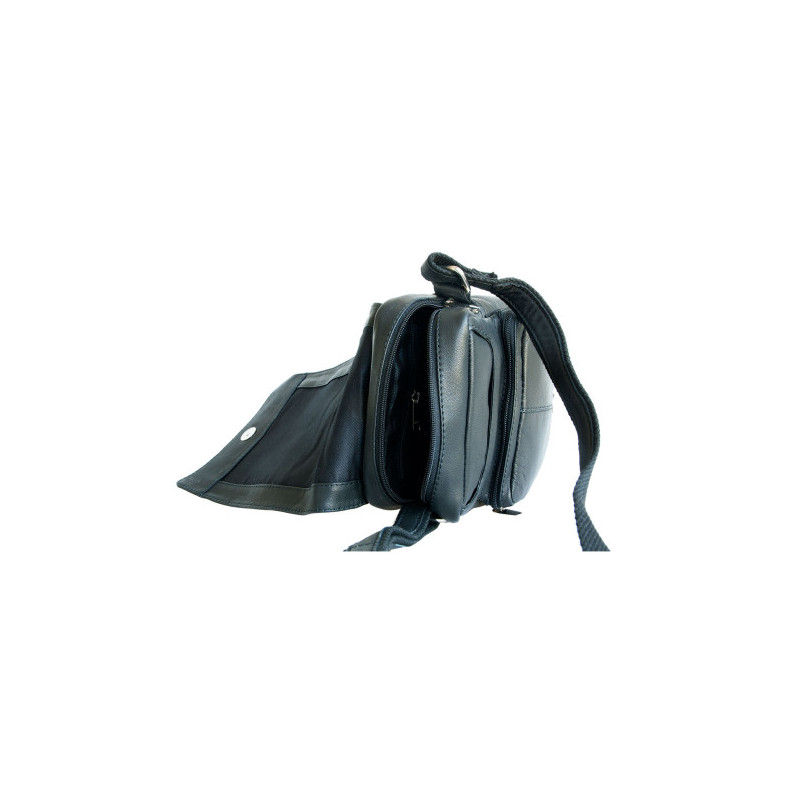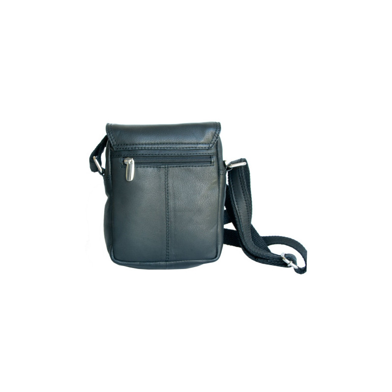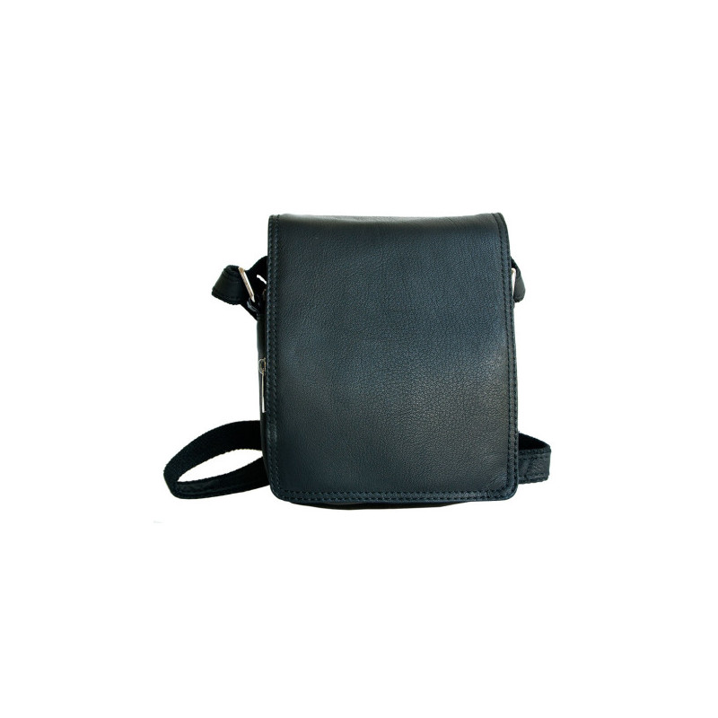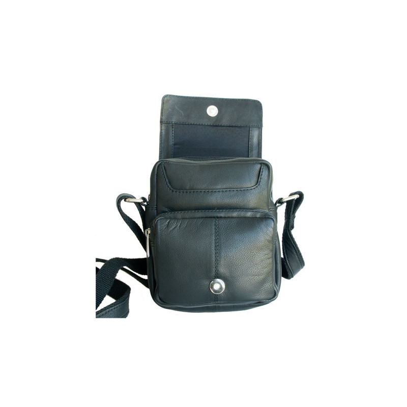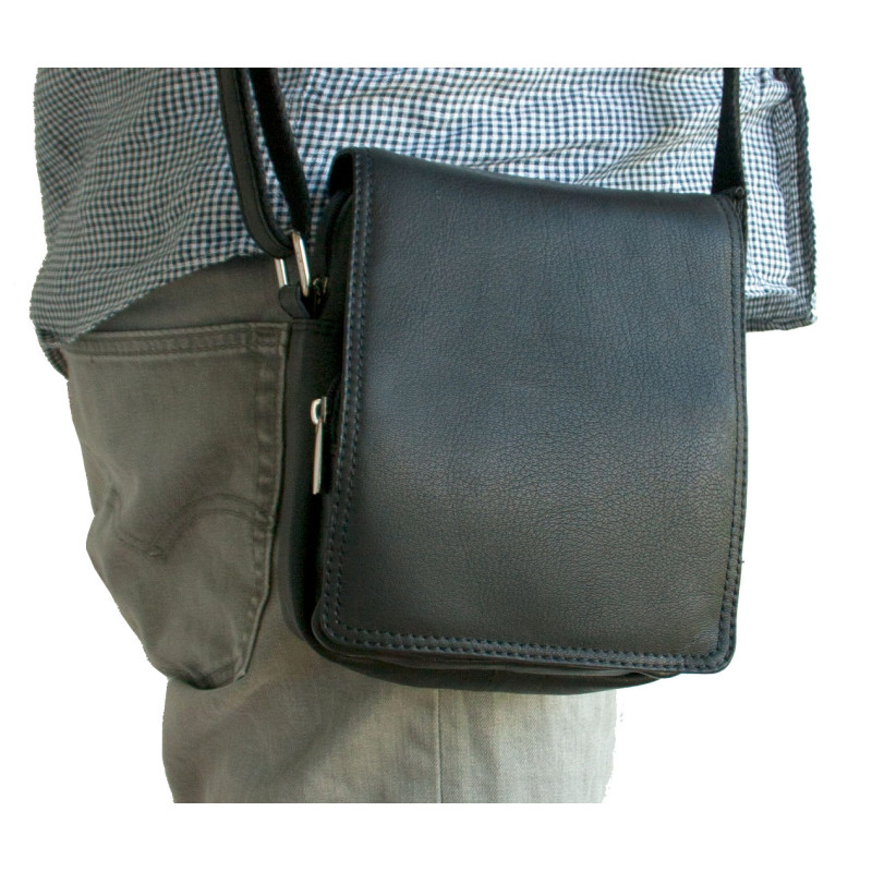 Malá pánská taška z měkké černé kůže s popruhem přes rameno. Rozměr 16 x 19 cm. Tloušťka podle plnnosti 6-10 cm.