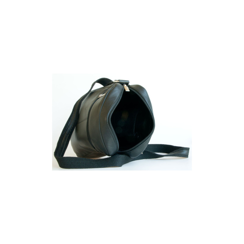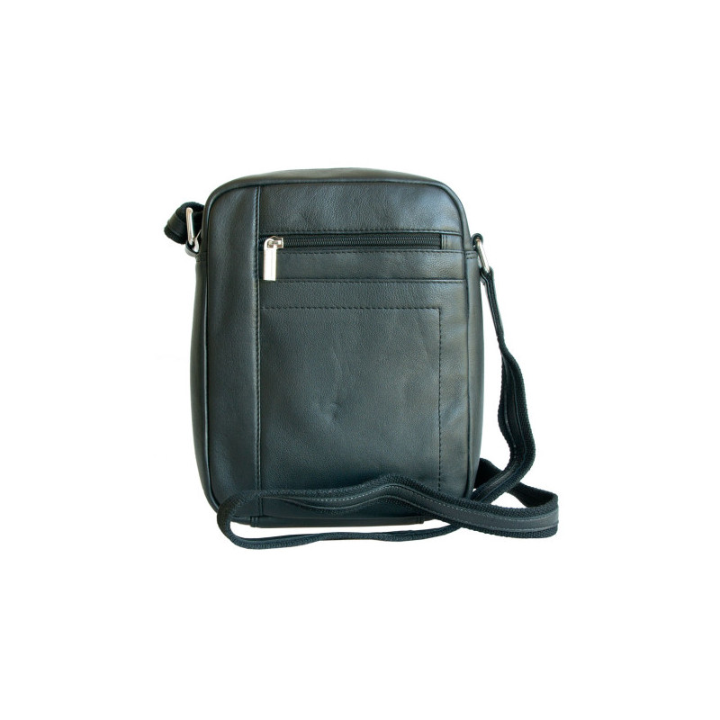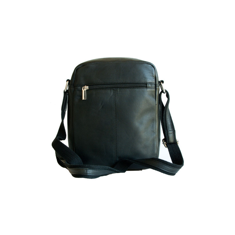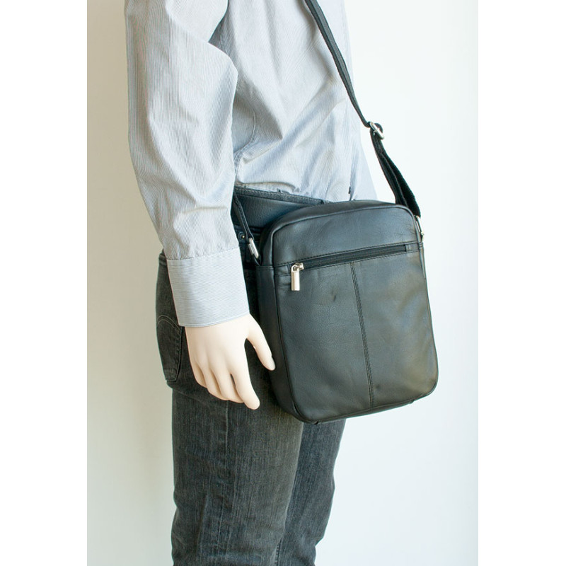 Střední pánská taška z měkké černé kůže s popruhem přes rameno. Rozměr 16 x 19 cm. Tloušťka podle plnosti 6-10 cm.