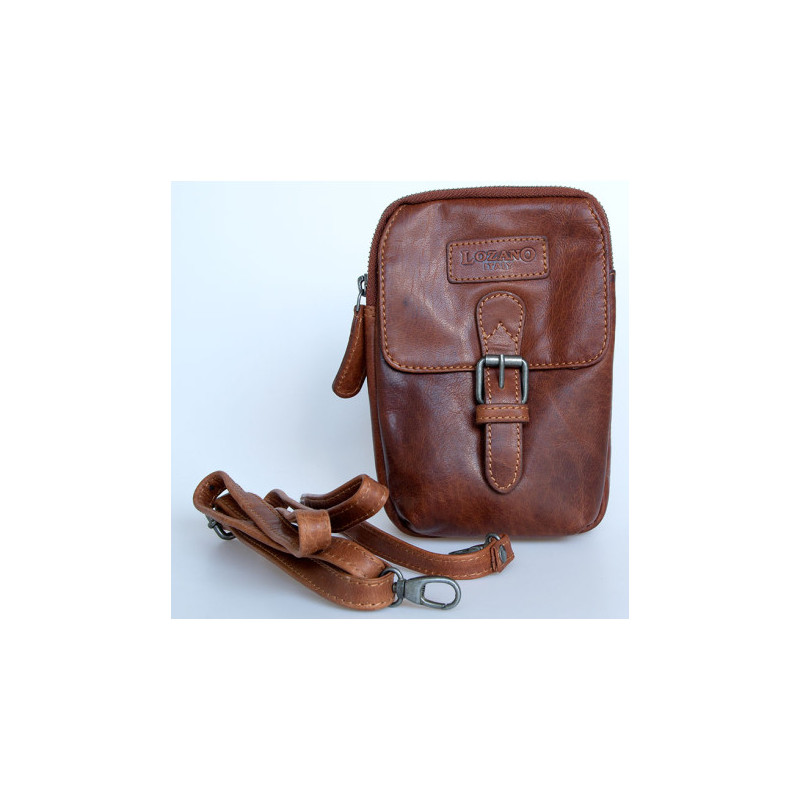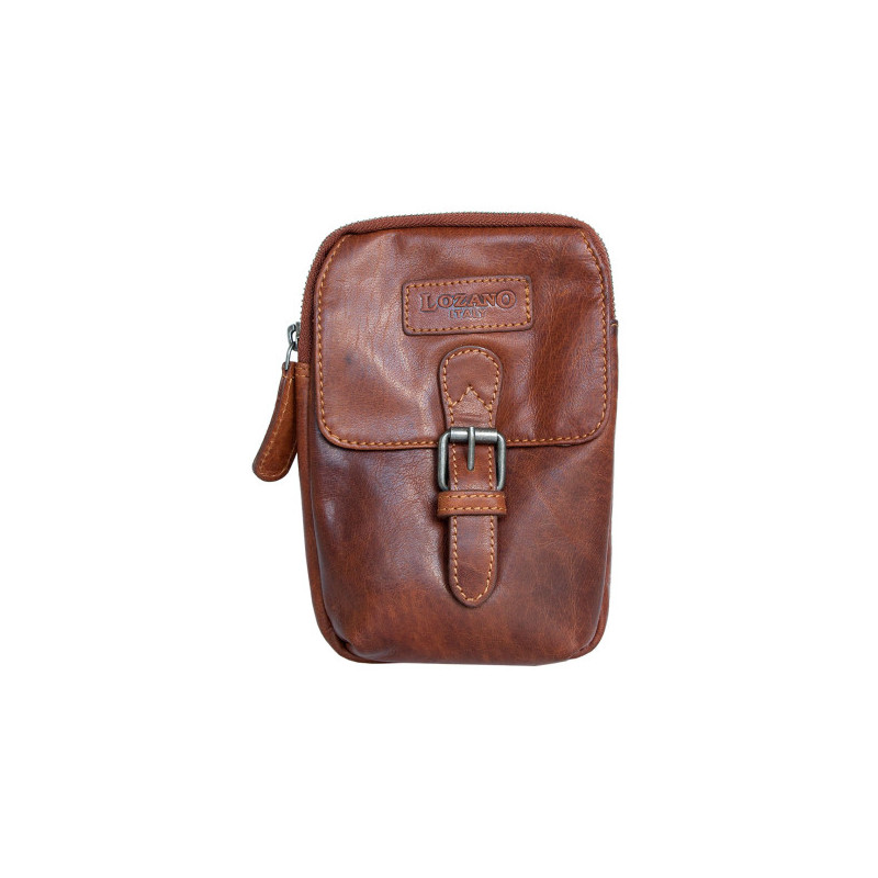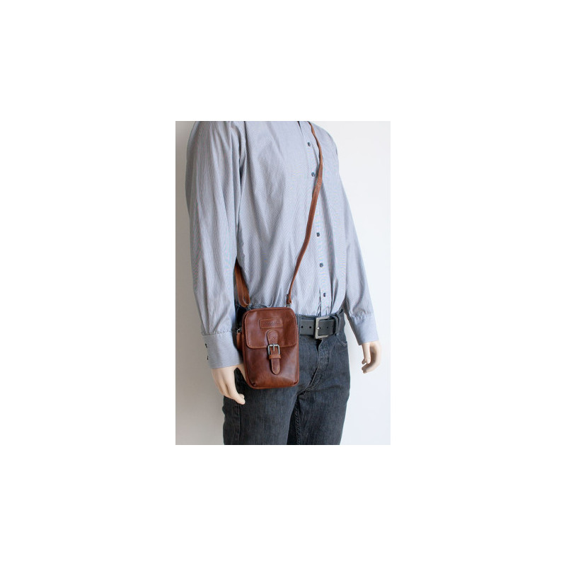 Malá pánská taška Lozano ze světle hnědé kůže s látkovou podšívkou, s poutkem za pas a popruhem přes rameno. Rozměr 13 x 19 cm. Hloubka podle plnosti 5 - 9 cm.