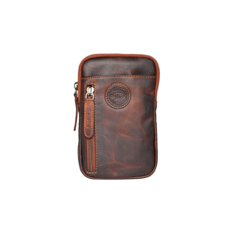 Tmavě hnědá kožená taštička Pedro na pásek nebo přes rameno z hlazené kůže s látkovou podšívkou. ROZBALENÁ Rozměry 12,5 x 18 x 8 cm.